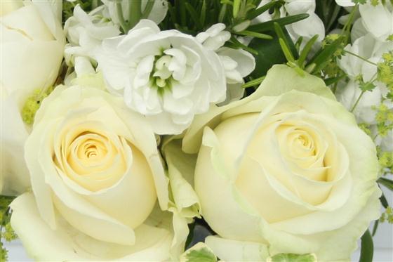 A dainty vintage style display of white and cream summer stems including stocks and roses.