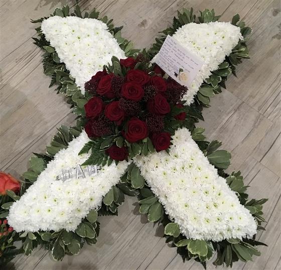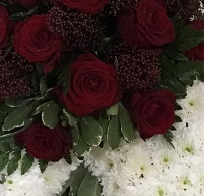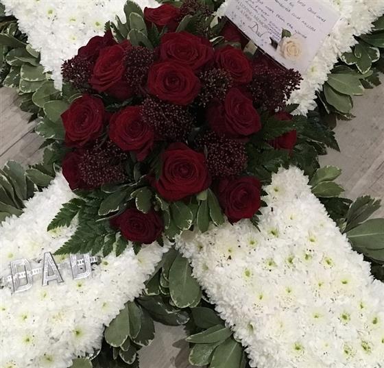 Edged in foliage, based in white chrysanthemums and a red rose spray.