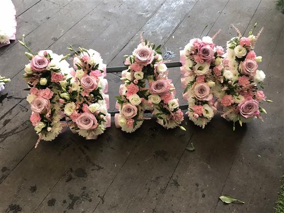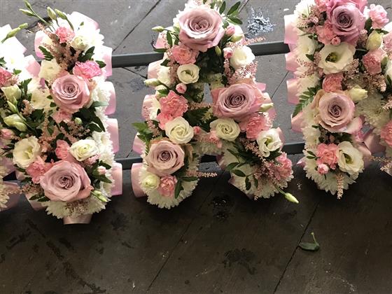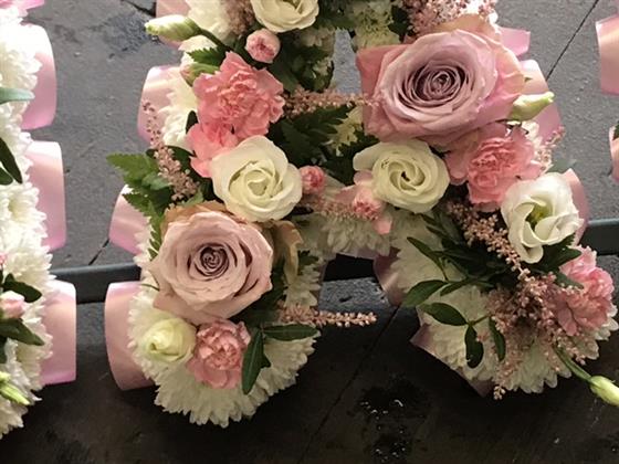 Luxury pink nan tribute. Edged in pale pink ribbon, white chrysanthemums and pink roses, pink spray carnations, pink astilbe and white lizianthus running through the centre.