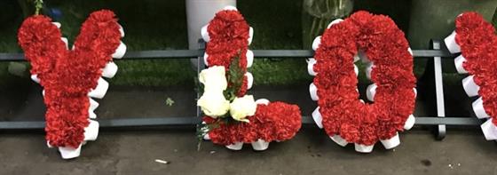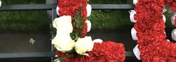 Edged with white ribbon, based with red carnations with white rose sprays.