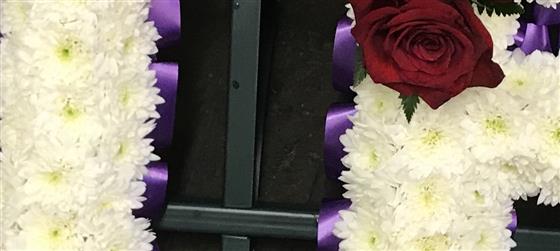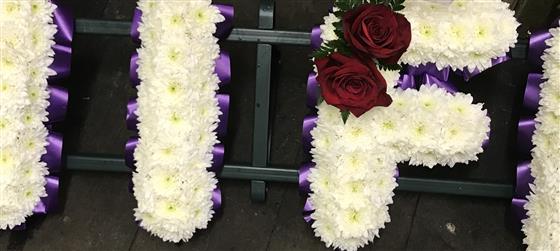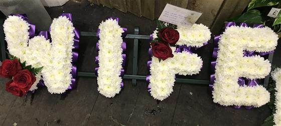 Our lovely WIFE tribute is edged with purple ribbon, based in white chrysanthemums with red roses sprays.